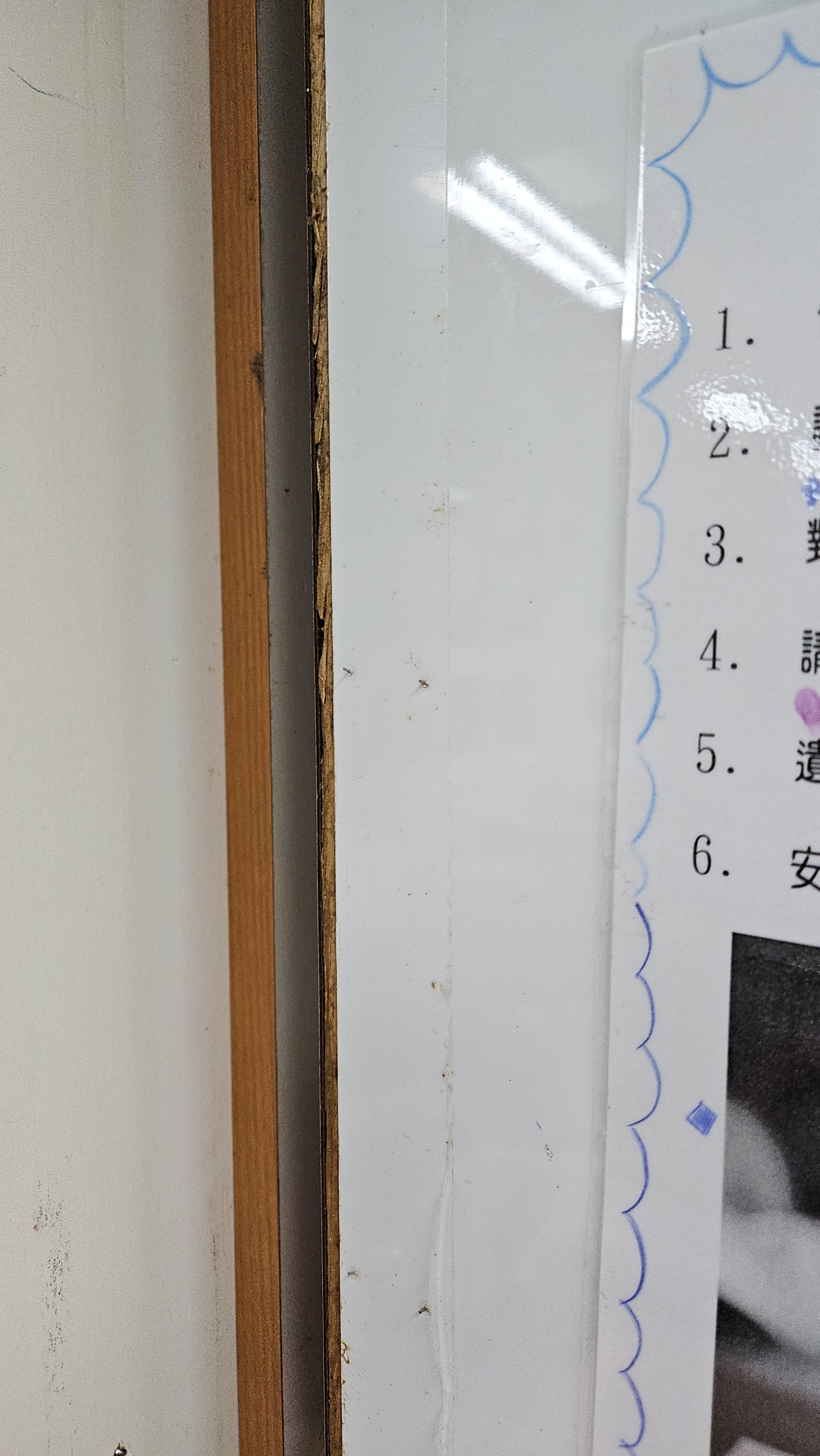 後櫃白板裝飾條脫落消失,釘子尖端露出,使用時易受傷