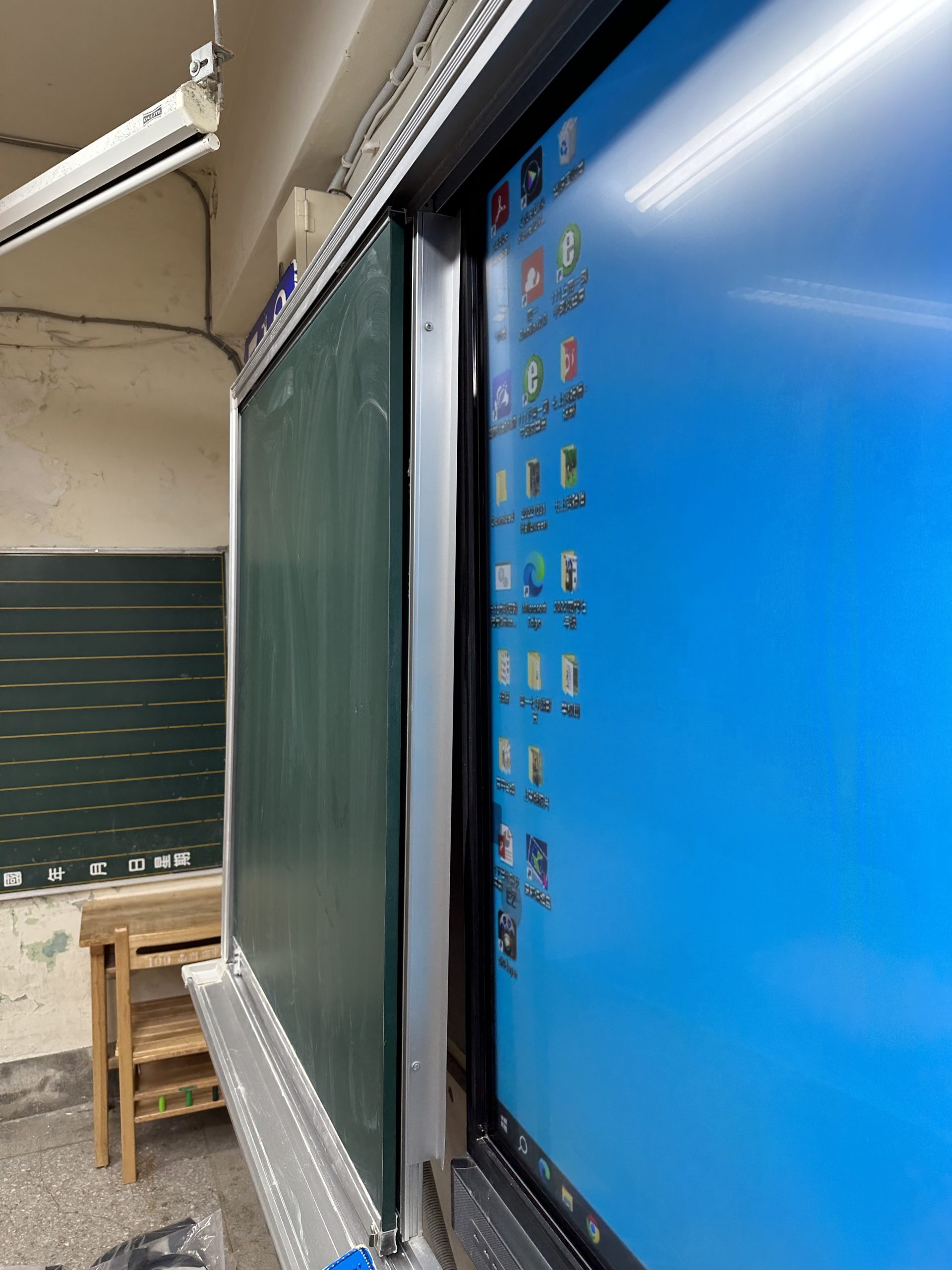 面向黑板左側螢幕與黑板之間的金屬歪斜