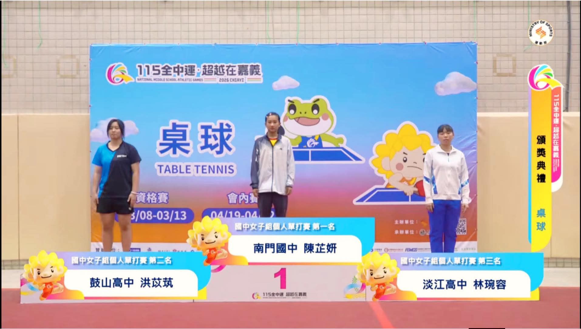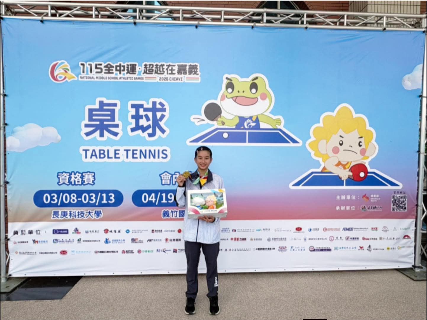 [技冠群芳]桌壇新星!915陳芷妍全中運女桌單打封后,勇奪全國金牌,為校爭光!! 狂賀!本校 915 班陳芷妍同學在 115 年全中運桌球女單賽事中,以勢不可擋的氣勢勇奪全國冠軍! 賽場上,芷妍憑藉敏捷身法與犀利抽球,展現了身為青少年桌球國手的強大實力。劉增銘校長特別勉勵:「芷妍在場上沉穩應戰,展現出追求卓越的精神,不僅是她個人多年苦練的甜美果實,更是南門國中全體師生的驕傲。」感謝蔡宏仁、林恆名及黃騰帟教練團的專業指導,讓我們共同為這份閃耀的榮耀喝采!